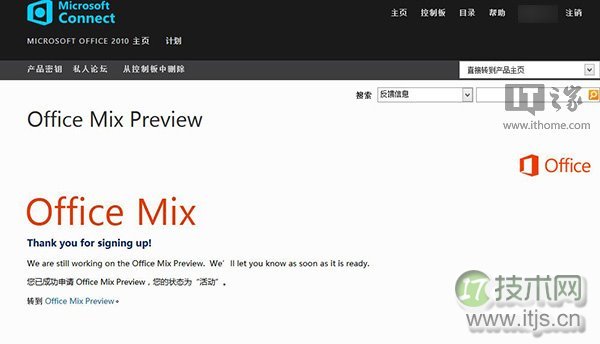 3、这时,我们成功完成Office Mix预览版申请工作,继续转向Office Mix预览版;