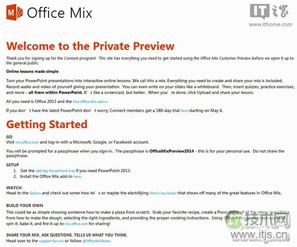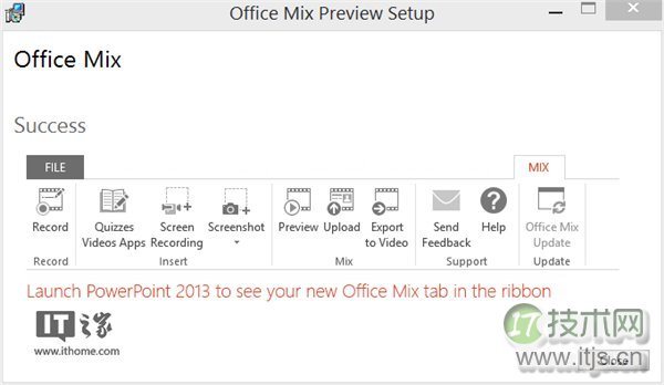 IT之家提醒下用户,使用Office Mix预览版服务时,我们必须提前安装Office2013 SP1办公套件中最新PPT组件,不支持Office2010等产品。
