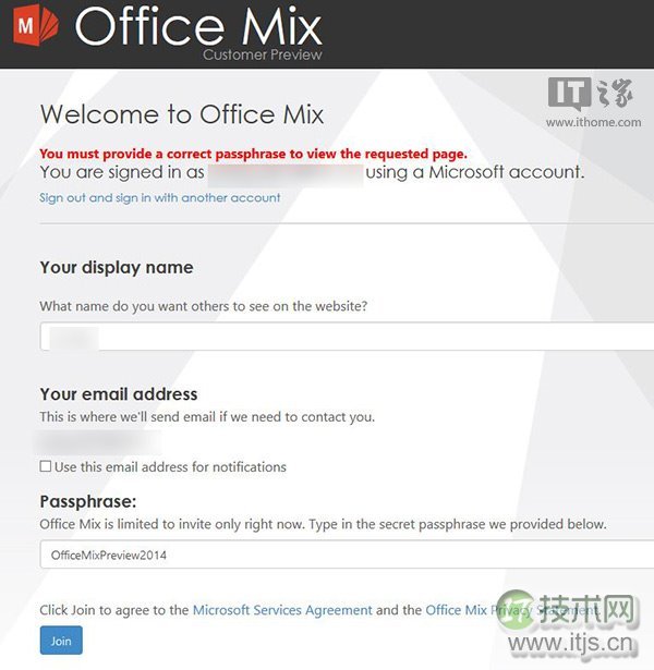 2、这时,我们成功来到Office Mix预览版申请页面,继续注册现有的微软账户,点击右下角的“提交”;