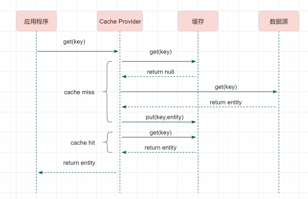 从缓存读取数据,读到直接返回。如果读取不到的话,从数据库加载,写入缓存后,再返回响应。这个简要流程是不是跟Cache-Aside很像呢?其实Read-Through就是多了一层Cache-Provider而已,流程如下: