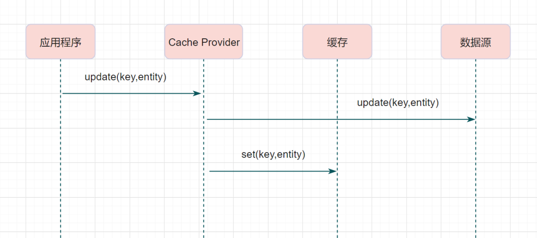 Write-ThroughWrite-Through模式下,当发生写请求时,也是由缓存抽象层完成数据源和缓存数据的更新,流程如下: