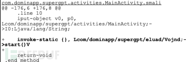 载荷植入比较恶意应用程序与合法应用程序之间的b2b信息网差异,很明显可以发现恶意代码为以下 Smali 代码的部分: