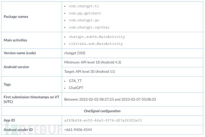 证书有效期:2008 年 0 月 29 日至 2035 年 7 月 17 日序列号:936eacbe07f201dfSHA-1 指纹:61ED377E85D386A8DFEE6B864BD85B0BFAA5AF81样本大概分为两批:第一批样本向一个硬编码的泰国付费号码发送短信,并使用 OneSignal 服务;第二批样本向另外两个硬编码的泰国付费号码发送短信,并且不再使用 OneSignal 获取配置信息。第一批样本大约在 2023 年 2 月被使用,第二批样本大约在 2023 年 3 月被使用。