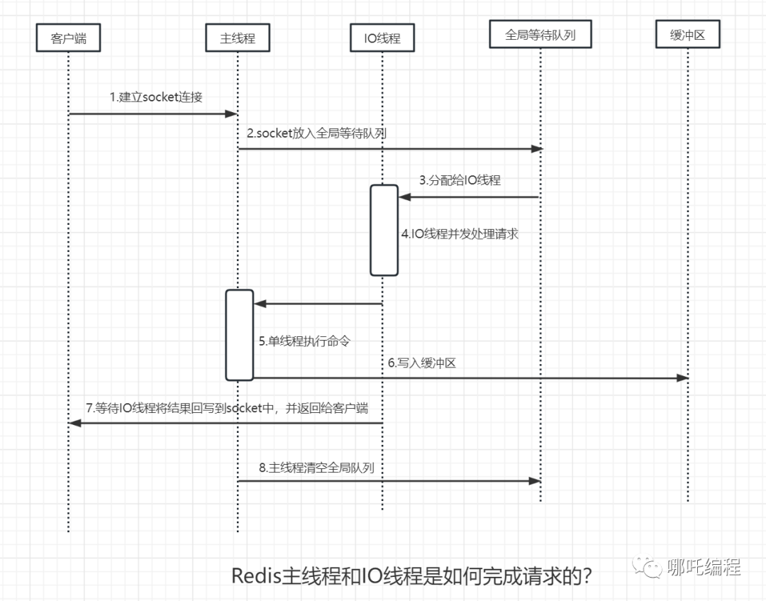 4、IO线程会写回socket和主线程清空全局队列当主线程执行完请求命令后,会将结果写入缓冲区,主线程进入阻塞状态,等待IO线程将结果回写到socket中,并返回给客户端。