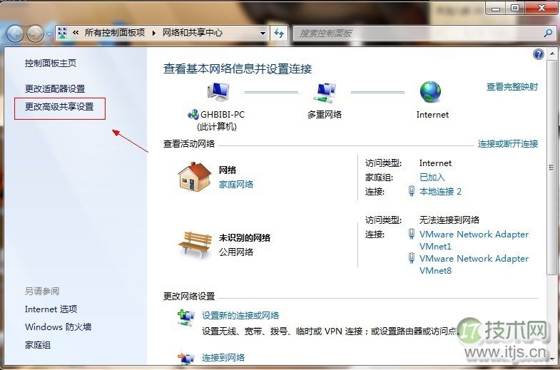 点击图中标出的共享共享位置“更改高级共享设置”出现下图。
