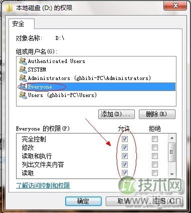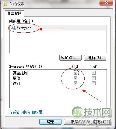 观察上图 “组或用户名”下面应该有个everyone 的用户,假如没有,点击“添加”添加该用户,下面的everyone的权限如图设置即可。