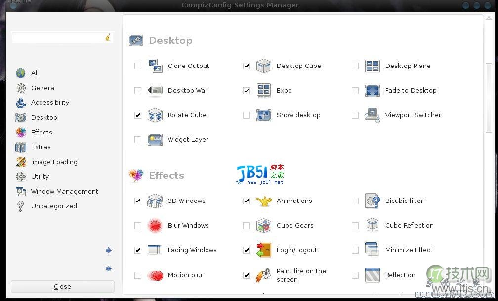 一旦安装好了 Compiz Config ,运行他,你会看到一个类似于如下图所示的界面: