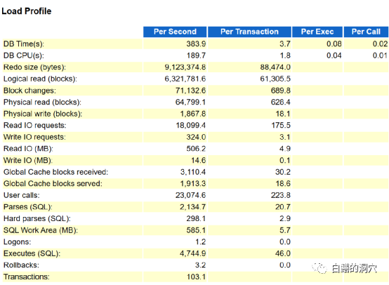 针对这个Load Profile我们可以看出系统中存在很多高负载的点,每秒redo超过9MB,逻辑读632万+,物理读高达6.4万+/秒,一小时内的服务器托管读写IOPS高达1.8万+,读IO吞吐量500MB+/秒,写IO吞吐量15MB/秒,每秒事务数100+,每秒执行数接近5000。针对这个负载文件,我们能给它找出食材配料表吗?