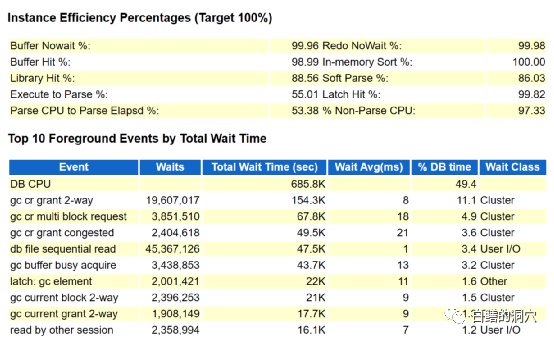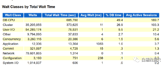 从等待事件的分类统计上看,DB CPU占了近一半,cluster排第二位,占了26.9%。似乎解决掉这两个问题,系统的主要问题就都解决了。不过到这里我们还是无法做出很好的判断,必须继续分析。