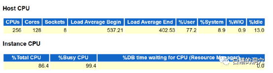 这时候我们需要继续查看CPU的情况,因为从主要事件上看,CPU占比较大。从这个报告上看,LOAD居然高达500+,这对于128核,256线程的7、8年前采购的服务器来说,有点高了。
